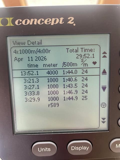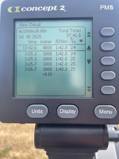 This moment was brought to you by 1km all-out repeats, rate-capped at 24 strokes per minute. A borderline abusive session that is one of the most challenging, but somehow also one of my favourites.